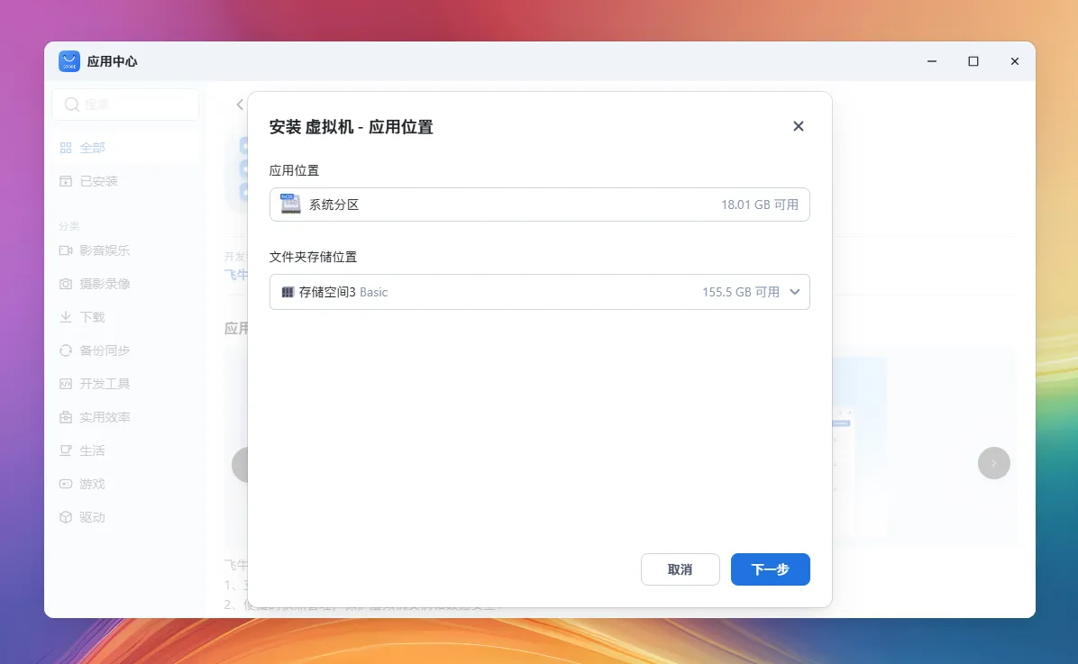 虚拟机应用将默认安装在系统分区。确认后,点击 下一步。
