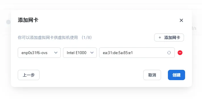 点击添加虚拟网络,分别选择对应的 OVS 网口,使用合适的网络类型,随机生成 Mac 地址或手动输入静态 Mac 地址。最多支持创建 8 个虚拟网络。