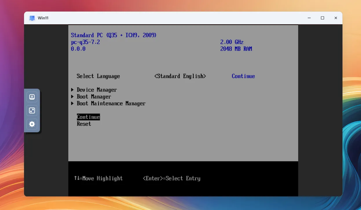 为再次出现 “Press any key…” ,可以保持 VNC 窗口连接,在列表中将虚拟机重启,或在 UEFI Shell 界面输入 exit 回车,然后选择 continue 回车,也会再次重启。