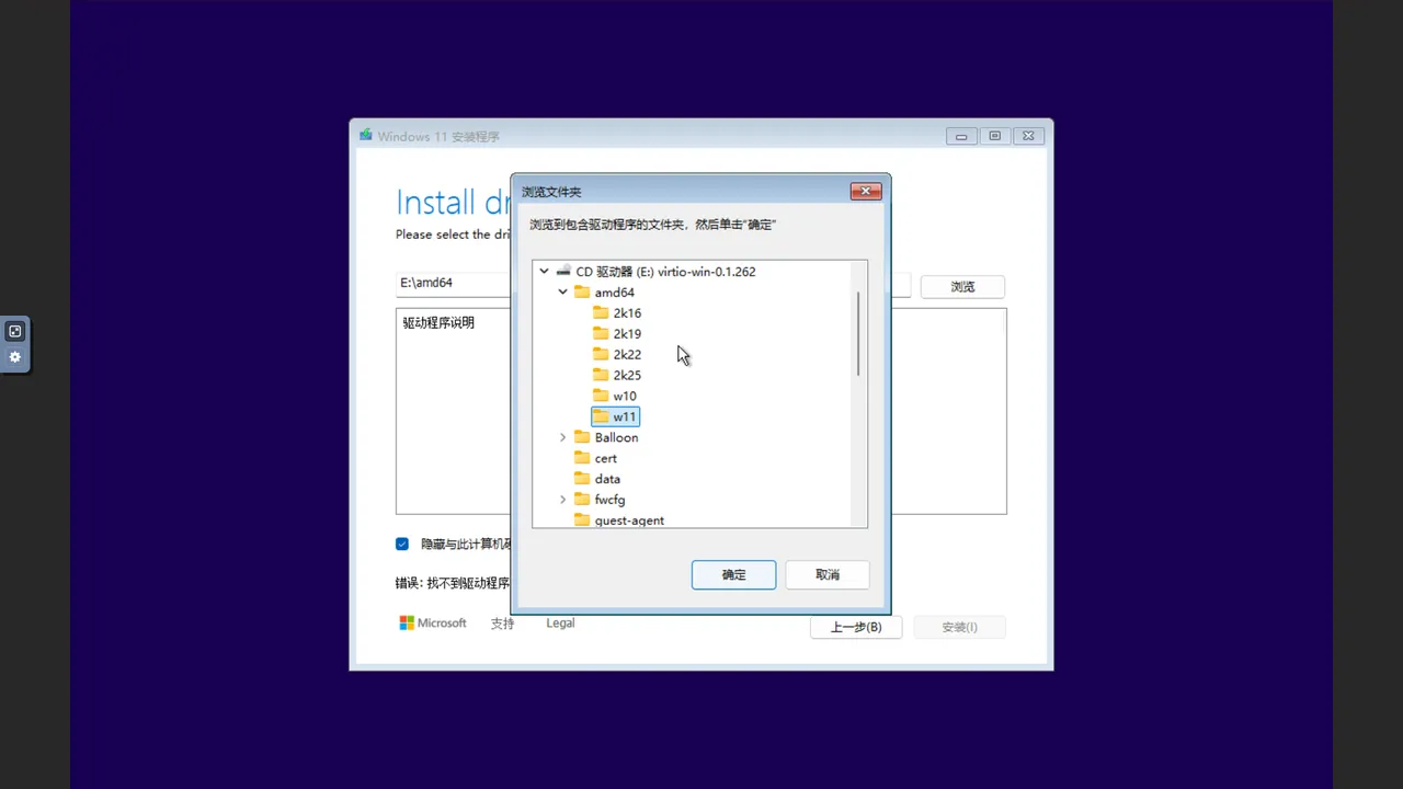 点击“浏览”,并选择 CD 驱动器 中的 amd64/win11 目录,点击确定。