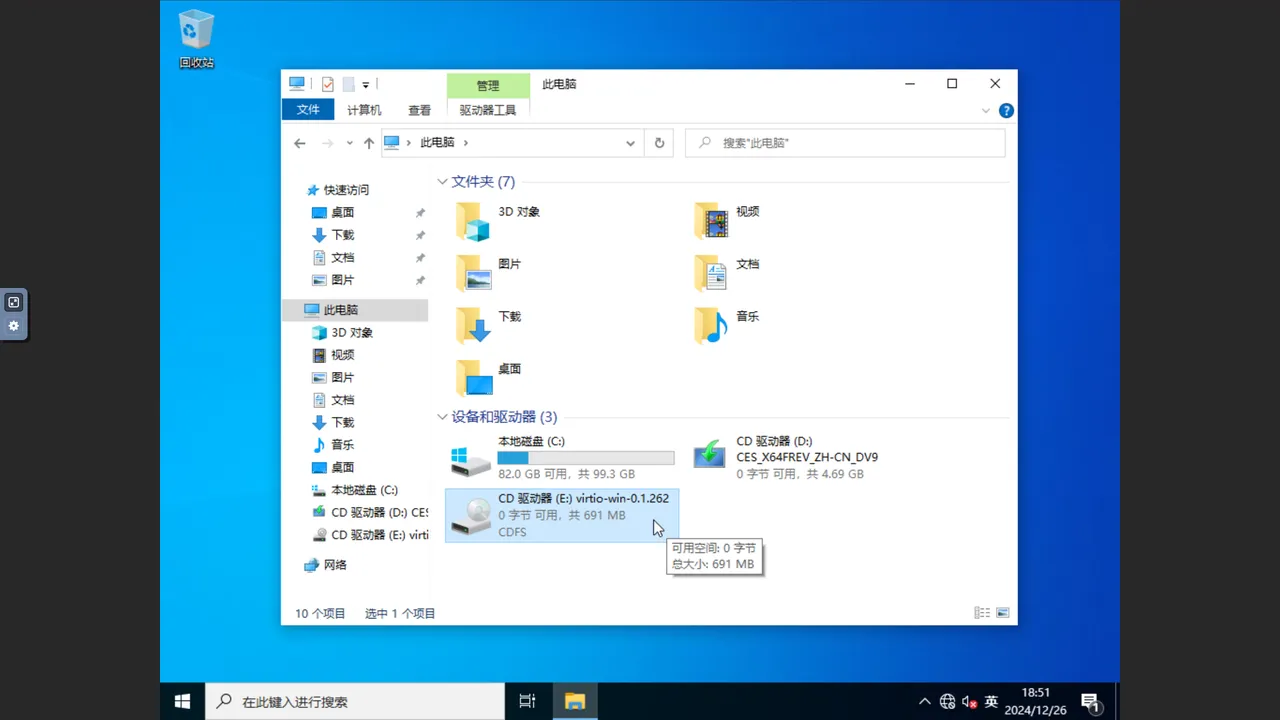 请先确认虚拟机已挂载驱动 ISO 文件,在完成驱动安装后方可移除驱动 ISO 文件。 打开我的电脑,点击打开 CD 驱动器